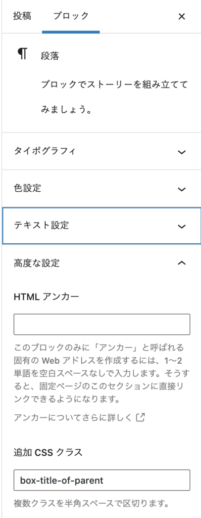 タイトルとなる1段落目の追加設定の[高度の設定]で、追加CSSクラスに「box-title-of-parent」と入力します。