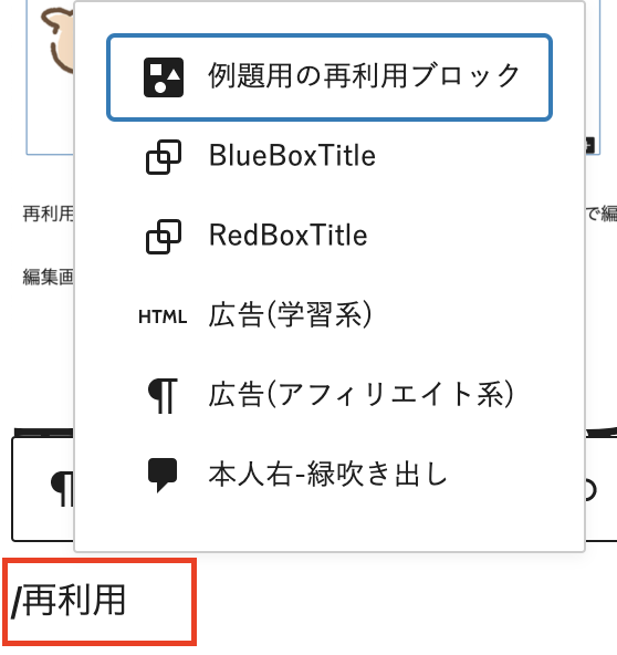 編集したい再利用ブロックを選んで、編集画面のタイトルを変更すれば再利用ブロック名を変更できます。